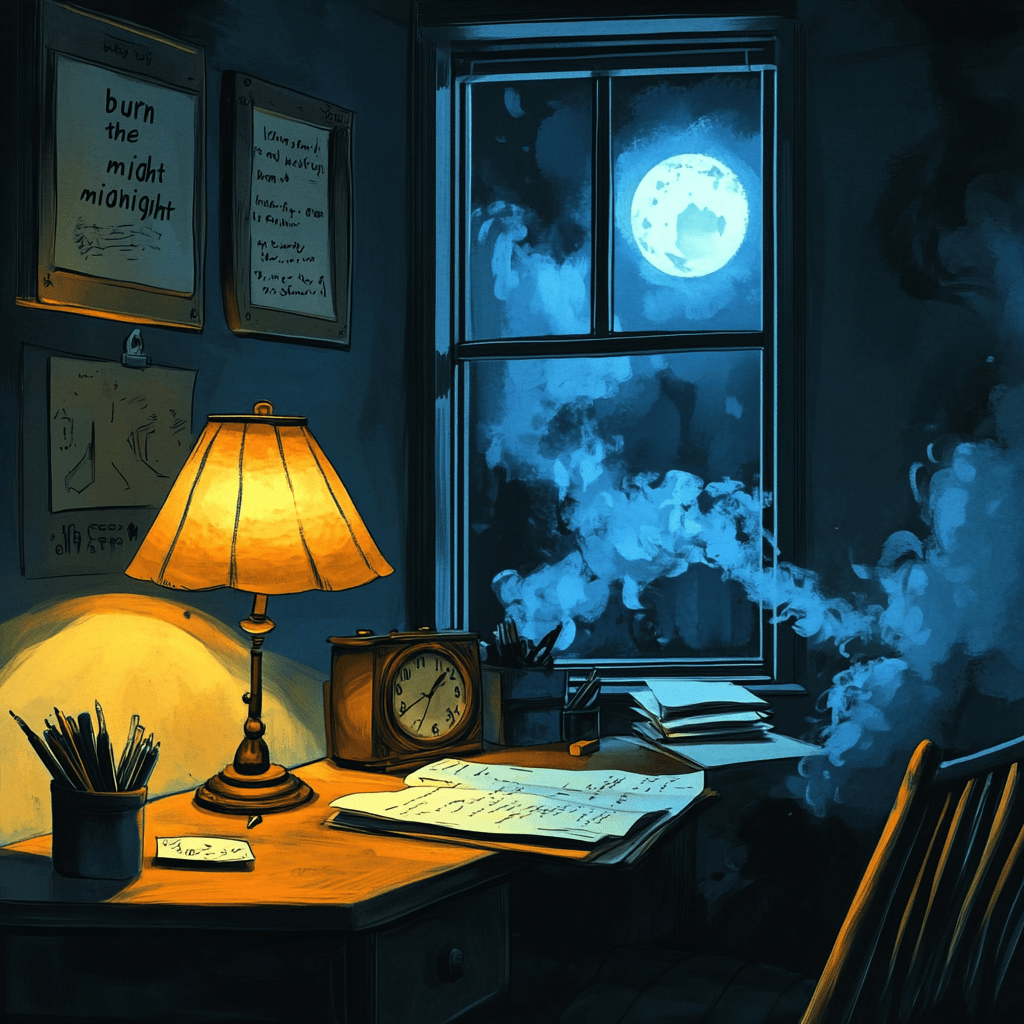 - Idiom này có nghĩa là làm việc hoặc học rất khuya, làm việc đến tận đêm khuya.