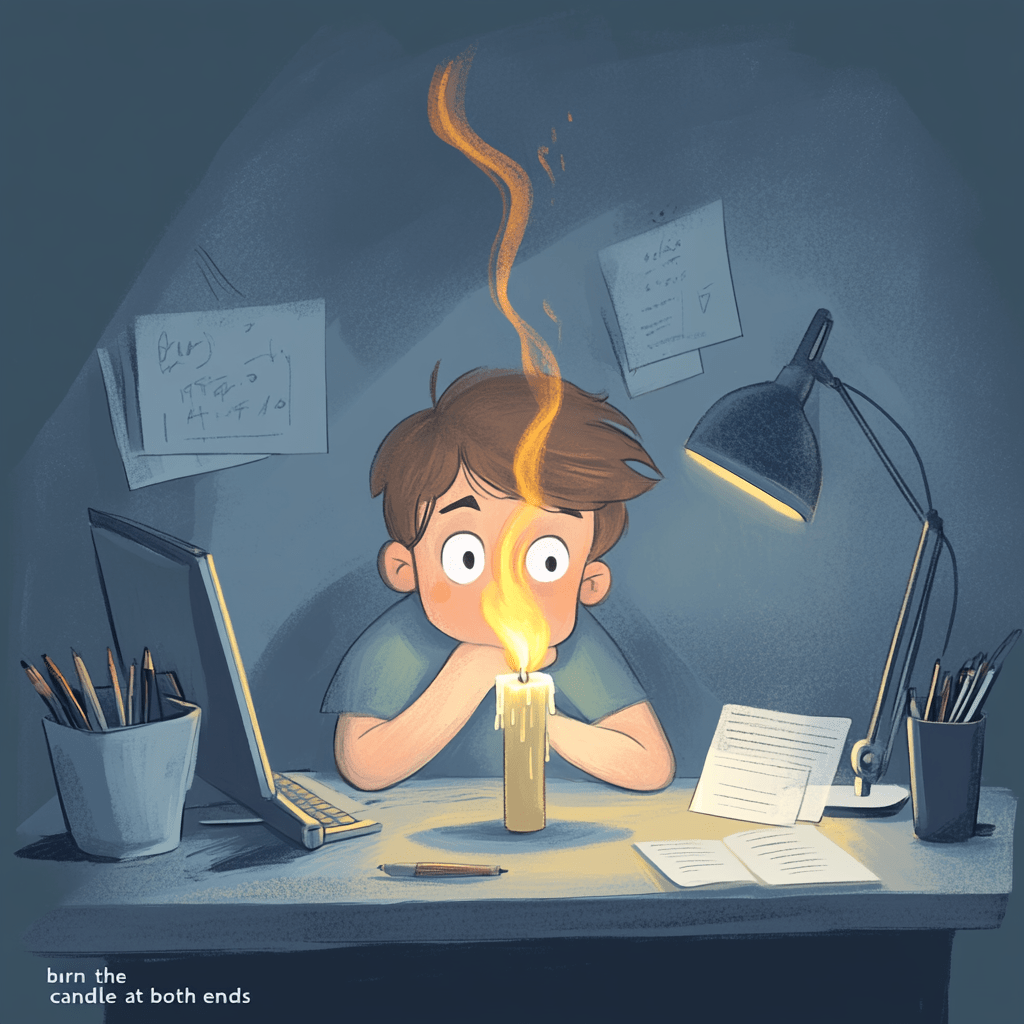 - Idiom này có nghĩa là làm việc quá sức, không biết cân bằng thời gian nghỉ ngơi, ám chỉ việc ai đó làm việc cả ngày lẫn đêm mà không có thời gian nghỉ ngơi hợp lý.