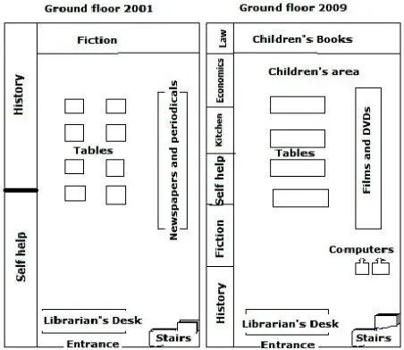 The diagrams compare the layout of a public library’s ground floor in 2001 and its current design.