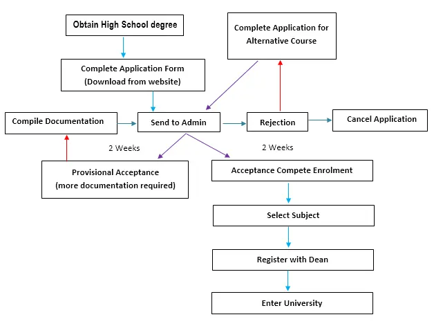 If the application is accepted, the student proceeds to full enrollment. They select their subjects, register with the dean, and finally enter the university. However, if the application is rejected, the student can either cancel the application or apply for an alternative course.