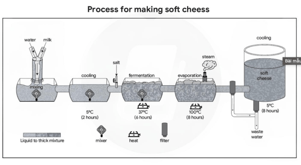 The diagram illustrates the process involved in making soft cheese, which consists of six stages, from mixing water and milk to the final cooling and separation of wastewater.