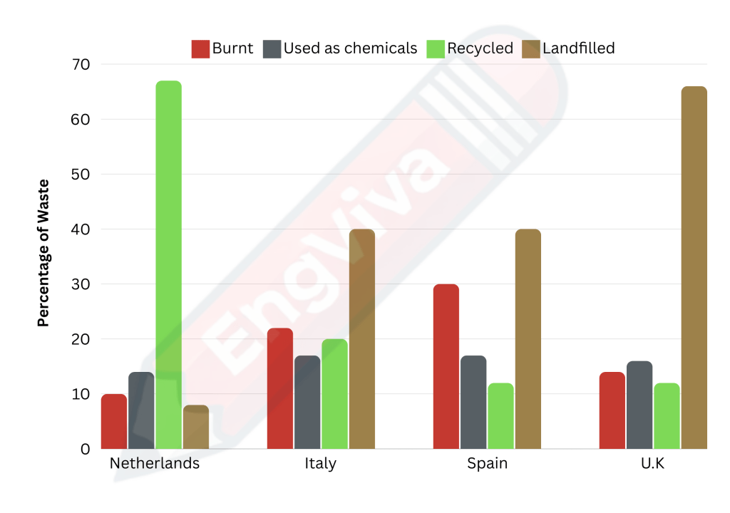The bar chart presents data on four different methods of waste disposal—burning, using as chemicals, recycling, and landfilling—across four countries: the Netherlands, Italy, Spain, and the UK. These methods show considerable variation in usage patterns among the countries.