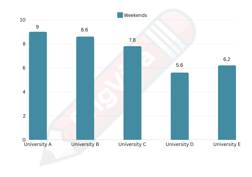 During the weekends, the hours of study decreased for all universities. University A had the highest number of study hours at 9, while students from University B and C studied 8.6 and 7.8 hours. University D had the lowest number of study hours on weekends with only 5.6 hours, followed by University E with 6.2 hours.